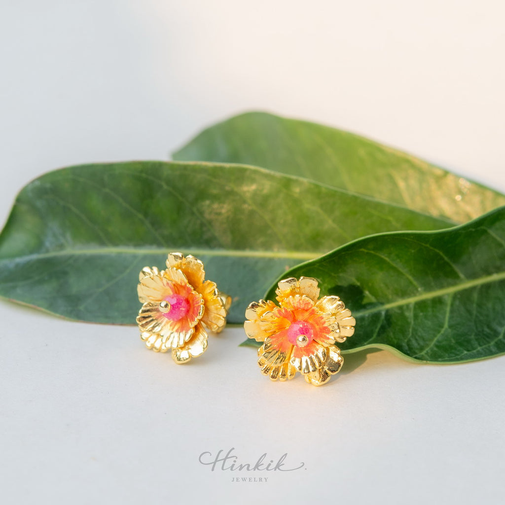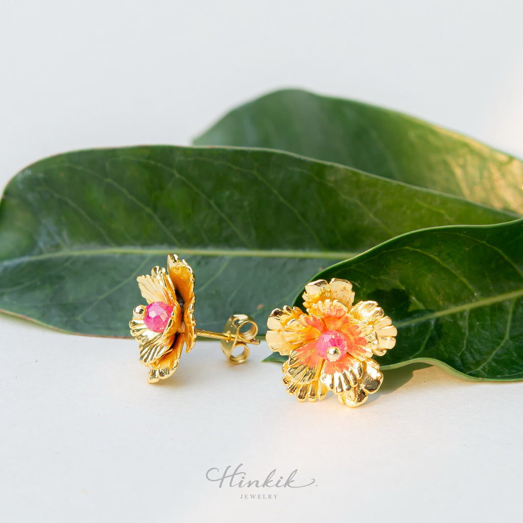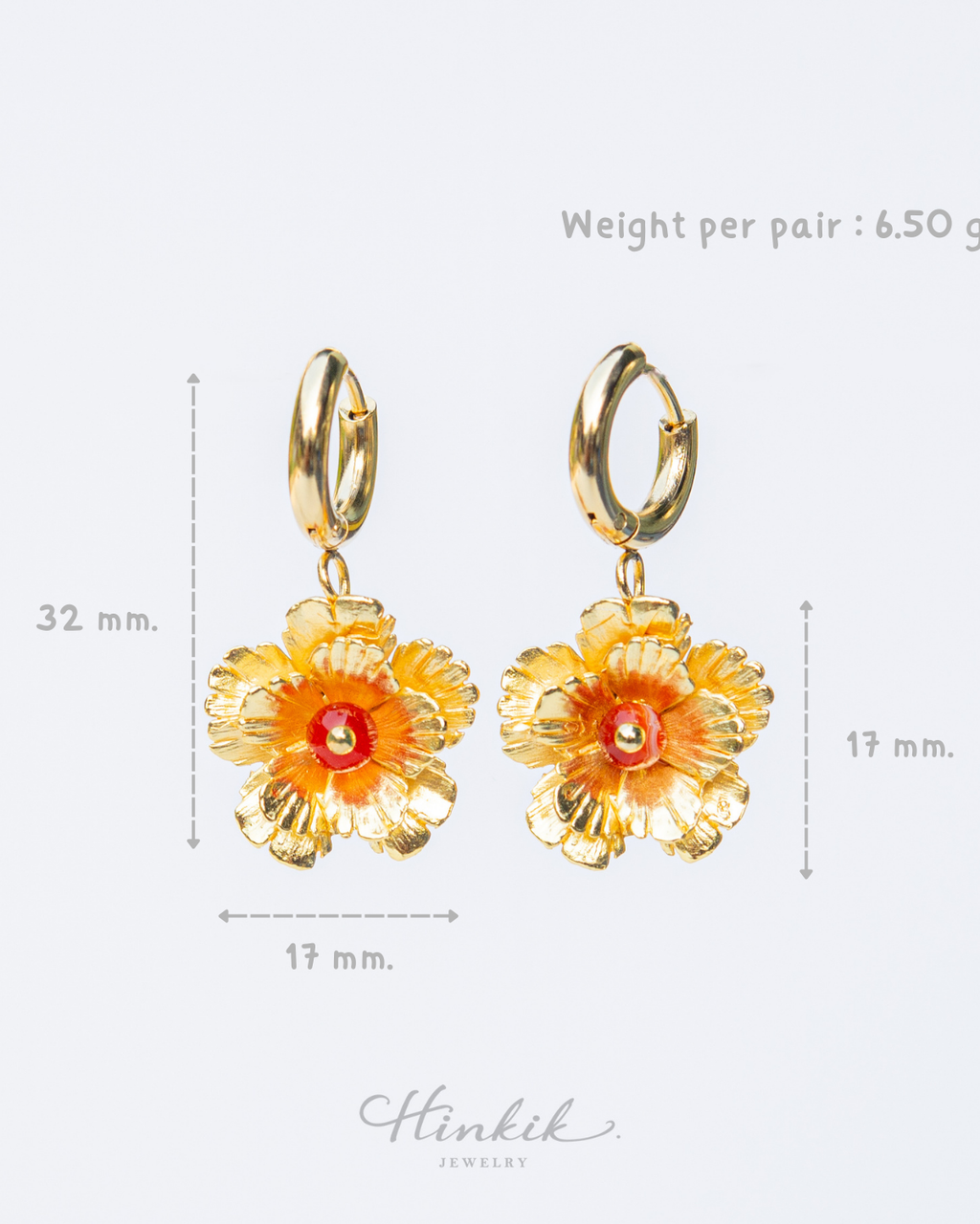 Elevate your everyday look with our exquisite Double Desert Rose Earrings. Featuring delicately crafted, fluttering petals and a vibrant orange-red Carnelian gemstone at the center, these earrings are finished in a radiant gold-tone for a luxurious and elegant touch. Perfect for adding a charm to any occasion.